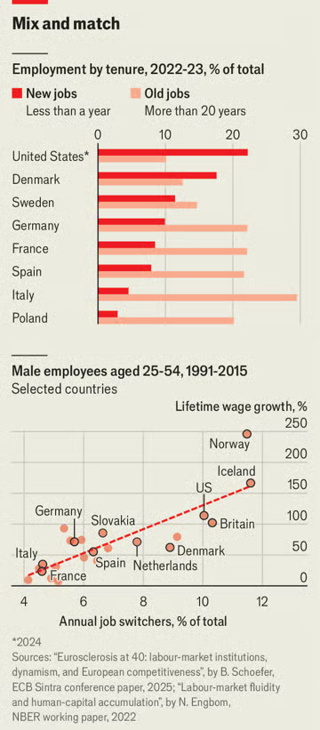 Long tenures once made sense. In an economy safe from disruption, businesses benefit from highly qualified, specialised workers and are willing to spend money training them. The labour-market practices that fit with such an economy—including high firing costs, tenure-related benefits and collective bargaining—are quintessentially European. But they fit neither the economy that policymakers are attempting to build, nor an age of tariffs and increasingly fierce Chinese competition. The European Investment Bank, which invests on behalf of the EU, has €70bn ($83bn) to spend on innovation by 2027. EU governments are now allowed to break state-aid rules when seeking to promote technological breakthroughs.
